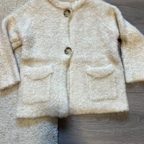 Zara genser i beige farge, størrelse 92, beregnet for jenter. Genseren har en tekstur med små prikker og en krage. Materialet er mykt med ribbestrikkede ermer. Det er et lite hull på bunnen som kan kreve reparasjon.