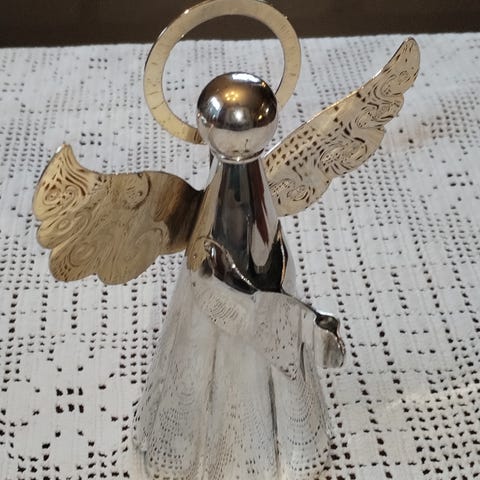 Engel laget av coca-cola zero-bokser. Kan fint stå på bordet, i hylla, henge i vinduet, brukes som julepynt eller på juletreet. Ca. 8,5 cm høy. Ny med lapp.