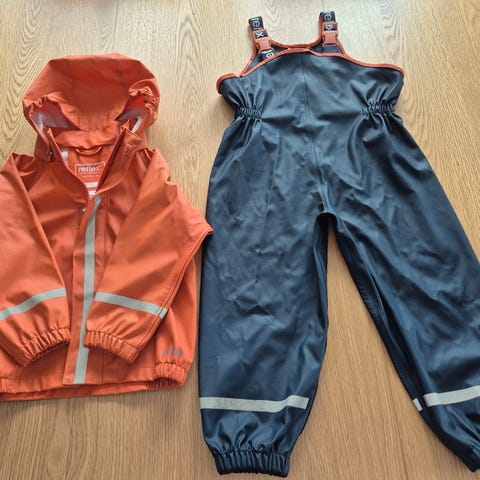 Pent brukt regnsett (jakke og bukse). Avtagbar hette. Slitesterkt design, ingen feil eller mangler. Fotstrikk i silikon er inntakt. Lite slitasje også i sliteområder som knær og ermestrikk (se bilder).