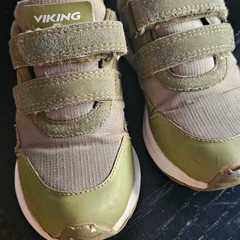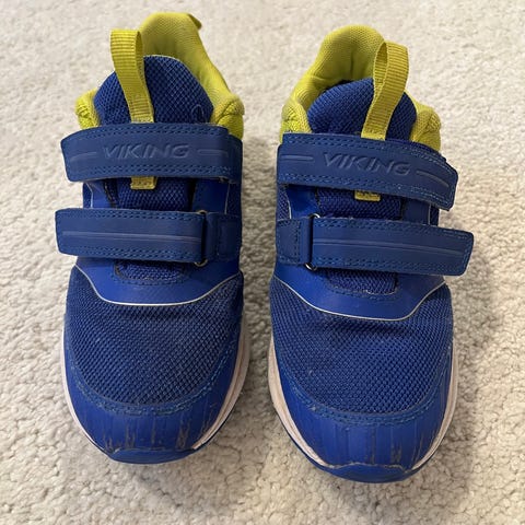 Viking barnesko i størrelse 31, unisex modell. Skoene har blå og gule farger, borrelåslukking for enkel tilpasning og er laget i slitesterkt materiale egnet for barn. Har ikke vasket de, så de ser mer brukt ut enn de er.