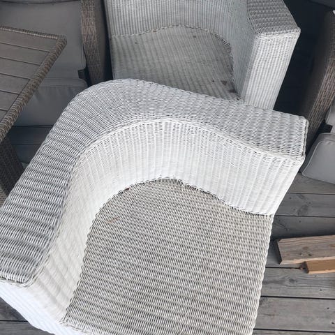 Jysk Jordrup stol med rund ramme i rotting og beige puter. Stolen har en stor, polstret pute som gir komfort. Puten har en malingsflekk på seg, som vist i bildet, men er ellers fin. Det er bare å vende puten for å skjule flekken.