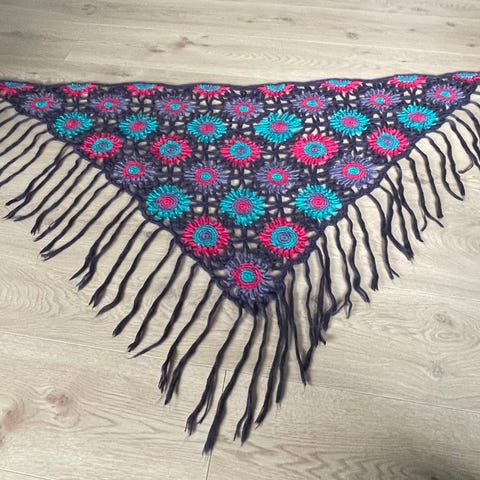 Vintage heklet sjal/skjerf med heklede blomster original 1980s.
