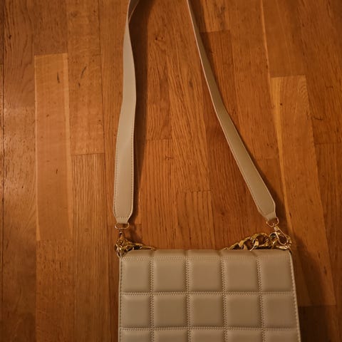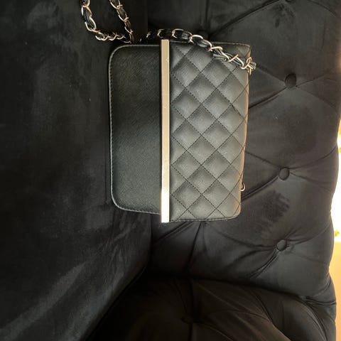 Skulderveske laget av plast i svart farge. Vesken har en justerbar skulderrem og en enkel, rektangulær form. Egnet for daglig bruk og tilbehør.
