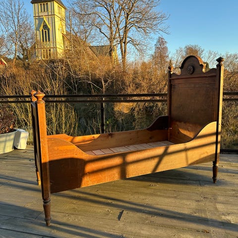 Plass til madrass er 180x75 cm. Sengen er 86 cm bred og