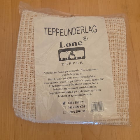 Jeg selger en ny pakker med Structur antiglid teppeunderlag, str. 180 cm × 280 cm.