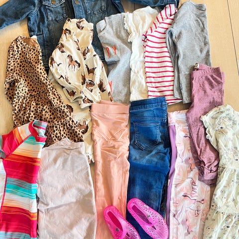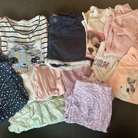 Pent brukte klær i god stand. Noen er merket størrelse 110, men de er litt små i størrelsen og ble brukt sammen med klær i størrelse 104.