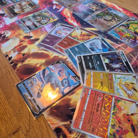 Selger 16 Pokémon-kort som ligger i penny sleeves.