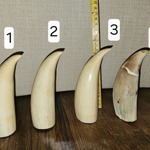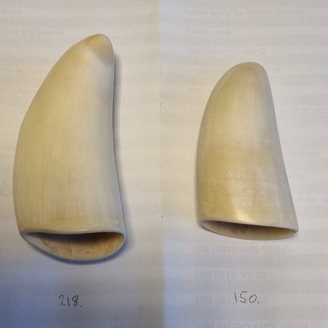 Tre stk. slirer i tre. Skåret i ett stykke tre. Den midterste trukket i skinn. Lengde: 17-23 cm. Kan pakkes godt og sendes hvis ønskelig. Pris er samlet.