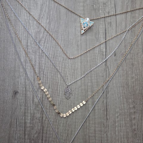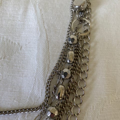 Kult tre lags smykke i sølvfarge, laget av metallblanding. Pent og lite brukt.