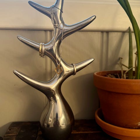 Få glede av smykkene også når du ikke bruker dem. Designeren Louise Christ har brukt høyglanspolert aluminium som gir et vakkert utseende og gjør at smykketreet ikke velter. Høyde 26 cm.