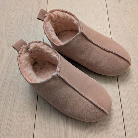 Tøfle for jente i størrelse 34. Tøflene har en rosa overdel med grå kant og såle. Materialet er mykt og egnet for innendørs bruk.