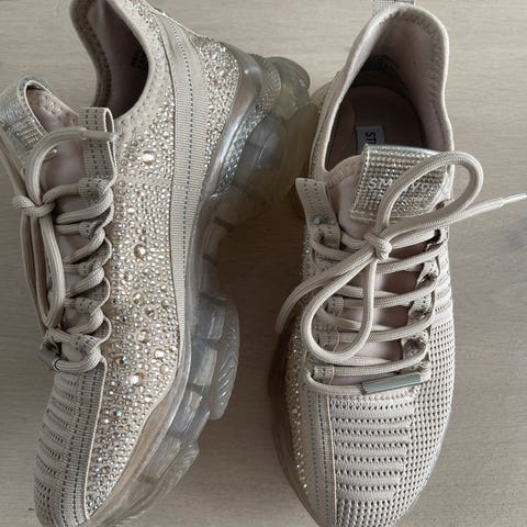 Steve Madden Mysteria sneakers i størrelse 39. Skoene har en svart farge og er laget av tekstil og syntetisk materiale. Designet for hverdagsbruk med snøring for justerbar passform. Passer en str 38, litt små i størrelsen. Ny pris ca 1499,-
