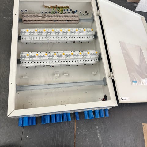Overspenningsvern, hovedbryter og pisk er med. Bare henting