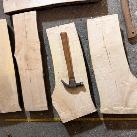 2 mellomstore emner av spisslønn. Kan sikkert brukes til å lage skilt, flere skjærefjøler, serveringsbrett og lignende. Har stått ute i over 3 år. Begge sidene er grånet, delvis med mørke flekker, men jeg har høvlet bort en del. Det er også mulig at gråningen/fargingen gir flotte mønster om man vil dele den opp til f.eks fjøler, knivskaft etc. Ca 10+ kg per emne.