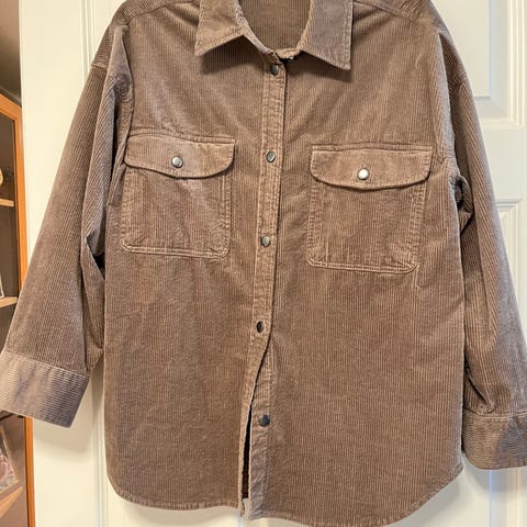 Cognacfarget tynn jakkeskjorte fra Soulmate som er svært lite brukt. Lett elastisk i tynn cordfløyel. Brystvidde 116 cm Lengde 72 cm. Ny pris kr 900.