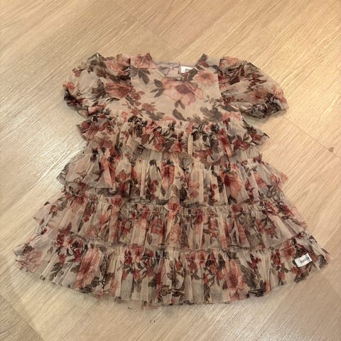 Den mørke rosa fargen fra blomstene ser ut til å være på et feil sted bak, var slik når jeg fikk kjolen, men da jeg kjøpte kjolene i mange strørrelser for å ha fremover merket jeg ikke dette før året etter og vi skulle ta den i bruk.