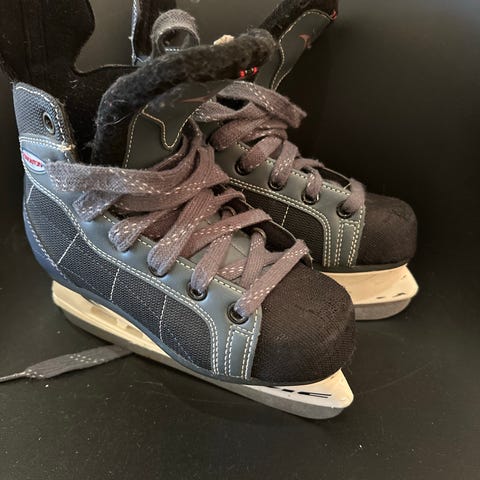 Edmonton Ishockey Skøyter for barn i størrelse 33. Skøytene er designet for ishockey og har svart og hvit farge med blå detaljer.