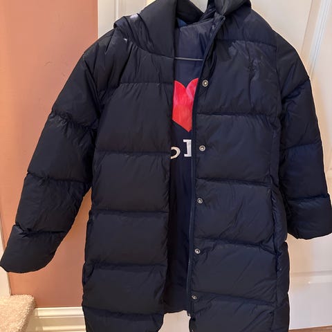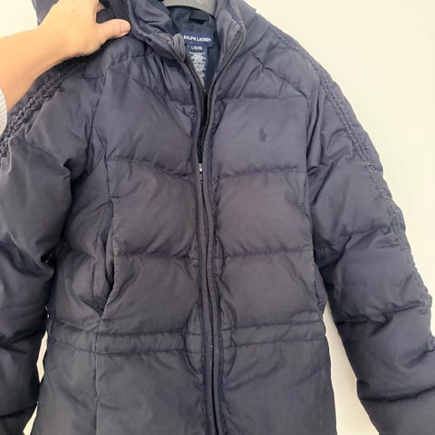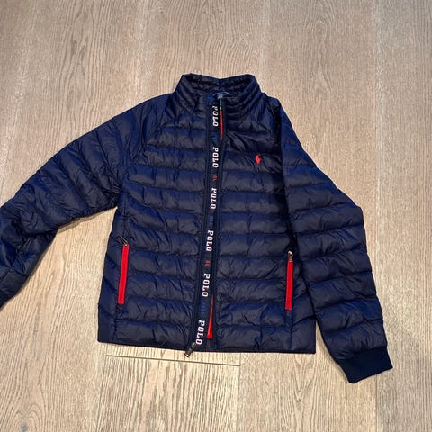 Ralph Lauren Polo jakke i blå farge, størrelse 140 for jente. Jakken har hette og glidelås, laget i lett materiale egnet for barn. Det er et mikroskopisk lite hull i stoffet som vist på bildet. Det befinner seg bak på jakken bak ved enden av jakken, men det kommer ikke noe dun ut derfra.