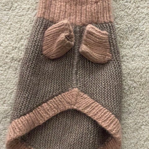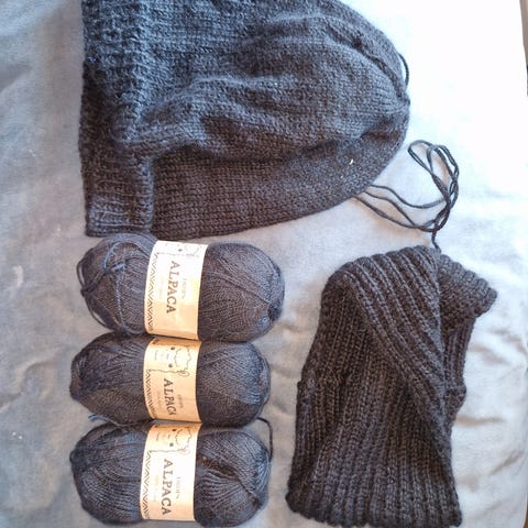 Lue med ører og hals strikket i to tråder Drops alpaca. Fargene er lys rosa og beige som gir fint fargespill. Str 74/80