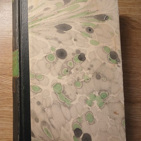 50 krInnbundet bok med marmorert omslag og en gammel liten bok til husmødreOsloLegg til som favoritt.