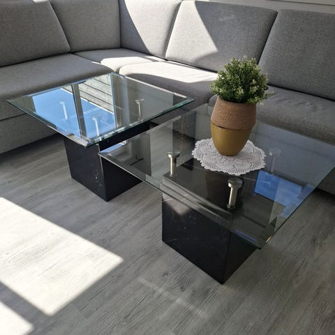 Pent bord med gullfarget understell i aluminium. Understellet er lett og glassplaten er tung.