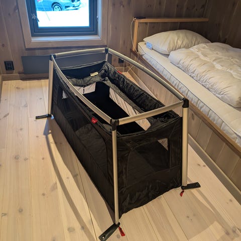 Sengen tar liten plass og veier kun 3.2 kg. Den kan lett pakkes ned i en vanlig koffert eller sekk. Perfekt å ha med på hotellrommet, telttur eller i parken enten til soving eller som lekegrind. Monteres opp og ned på et par minutter.