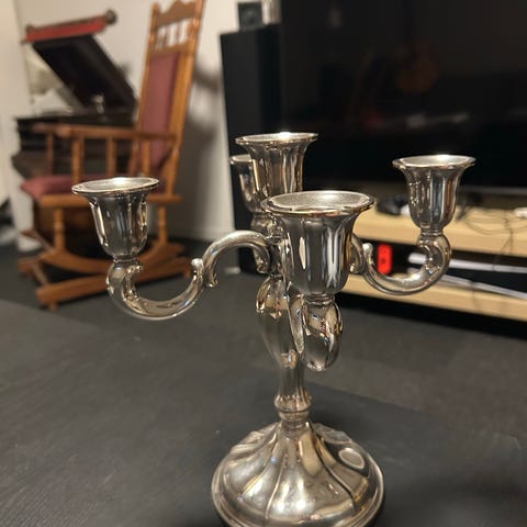 Et nydelig stk håndverk det i dag er vanskelig å finne nytt. Lysestaken består av en fot og en overdel med 3 armer. Delene settes i hverandre. Foten kan også brukes alene med 1 lys. Håndlaget i flere operasjoner. Tilsvarende stake med 5 armer kan i dag bestilles og koster rundt kr 120 000 (se Th. Marthinsen 's sider).