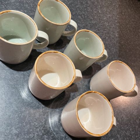 Selger 6 espressokopper med skåler og en krukke til enten kaffe eller kanskje sukkerbiter?