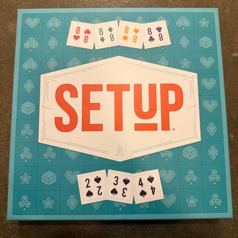 Setup er et morsomt familiespill med taktikk og tallrekker. For å score poeng skal man lage sett av spillets brikker.