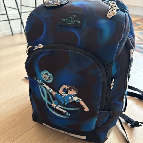Fin Beckmann-sekk med fotballmotiv. Pent brukt og i god stand.