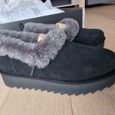 UGG Støvler i størrelse 38 for dame. Fargen er svart, og støvlene har en tykk såle. Materialet er mykt og isolerende, med en innside som gir varme og komfort.