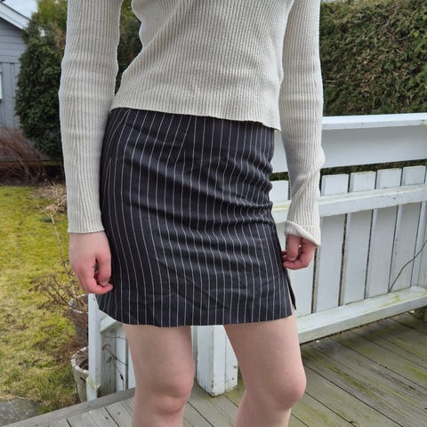 KappAhl strikket skjørt i beige farge med kort innerskjørt, størrelse XS. Kjolen har et mønster med hullstrikk og er laget for kvinner. Materialet er mykt og egnet for hverdagsbruk.