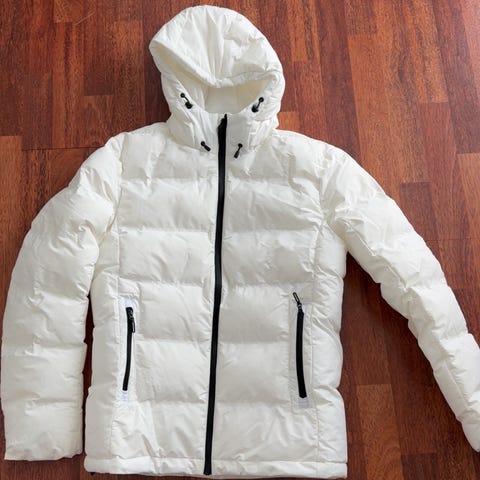 H&M jakke for barn i størrelse 174, hvit farge. Jakken har hette og glidelåslommer. Passer for gutt. Laget for å gi beskyttelse mot vær og vind.