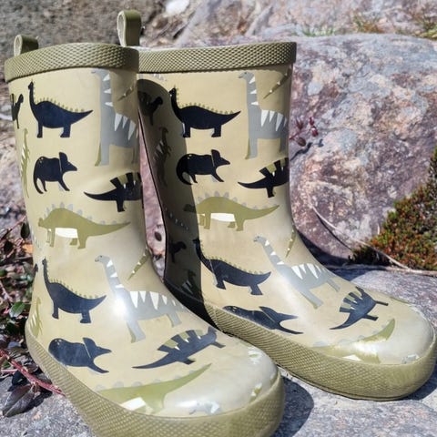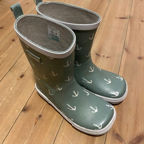 Bisgaard gummistøvler for barn i størrelse 26. Støvlene har et kamuflasjemønster i grønne og svarte toner. Designet er unisex og laget for å beskytte føttene mot vann og gjørme. Materialet er vanntett gummi, egnet for utendørs bruk i vått vær. Noen mindre bruksmerker, men pent brukt.