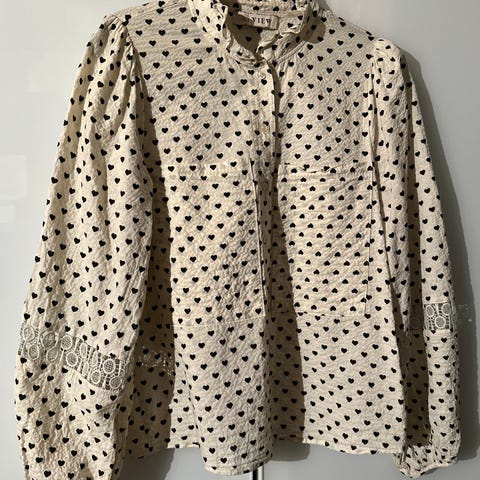 A-View Bluse i hvit farge, størrelse XL Blusen har et gjennomsiktig mønster med blomsterdetaljer og knyting foran. Materialet er lett og delikat, egnet for bruk ved ulike anledninger.