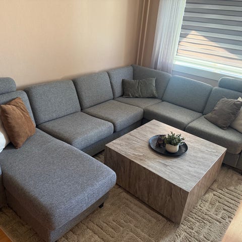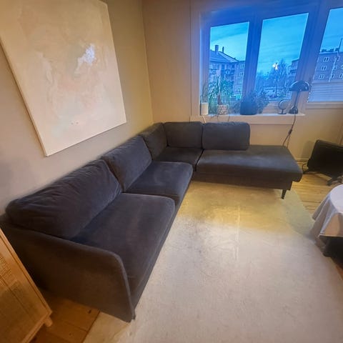 Selger pent brukt Furninova Avignon hjørnesofa i grå/beige. Stilren og komfortabel modell med dunputer og metallbein.