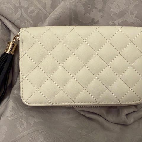 Søkeord: hvit veske, clutch, sminkepung, veske uten reim, quiltet veske, veskeorganizer, elegant veske