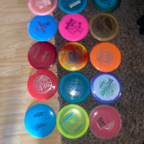 Samling av ulike disc golf frisbeer i forskjellige farger og materialer. Produktene varierer i design og merke, egnet for bruk i disc golf. Ingen spesifikke størrelser eller kjønn er angitt. D e nr på de og navn men kan også diskuteres pris