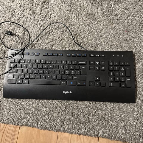 Logitech tastatur med norsk layout, svart farge, kablet tilkobling. Sennheiser hodetelefoner med mikrofon, kablet tilkobling med 3,5 mm jack og USB-adapter for lydkontroll. Passer til bruk med PC og andre kompatible enheter. 100 kr alt