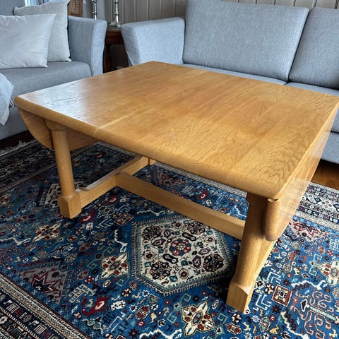 Solid og vakkert sofabord i heltre. Det har stygge flekker og merker i plata og må slipes og pusses for å bli pent igjen.