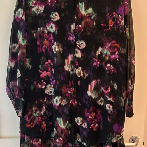 KappAhl flerfarget skjørt i størrelse XL for kvinner. Skjørtet har et fargerikt blomstermønster i lilla toner.