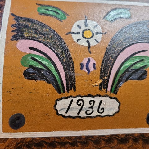 Vintage reiseskrin med dekorative metallbeslag og bymotiv