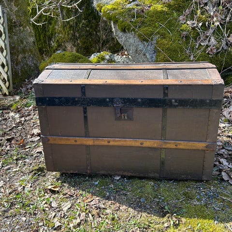 Vintage kiste i tre med metallbeslag og lås. Skrinet er foret med svart-hvitt bymotiv bilder fra Hamar på innsiden av lokket. Passer til oppbevaring av diverse gjenstander og kan brukes som dekorativt møbel.