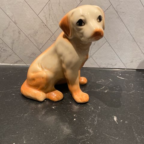 Selger en eldre porselenshund / schæfer med stempel. Den har håndmalte detaljer.