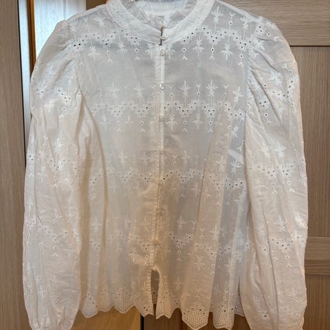 Skjorten har fine blondedetaljer i armene og er semi-transparent. Elegant og sommerlig hvit. Kan brukes med alt.