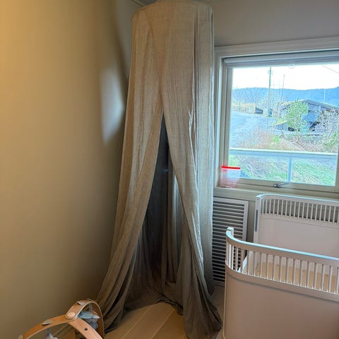 Følger også med hvit sengehimmel i bomull, med fint hjertemotiv i stoffet.