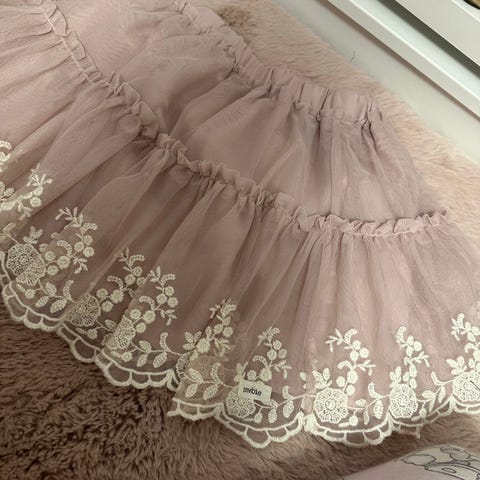 Newbie barneskjørt i hvit farge, størrelse 128, designet for jenter. Skjørtet har dekorative detaljer med broderi og perler, laget i et lett og luftig materiale som passer til barn og den andre skjørte er str 80 .