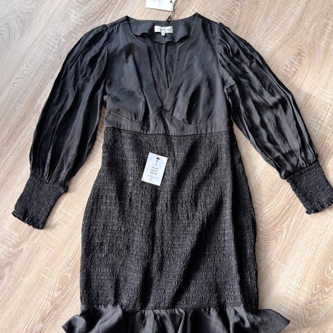 Michael Kors festkjole i størrelse M, farge svart. Kjolen har lange ermer, belte i livet, og er dekorert med paljetter som gir en glitrende effekt. Materialet er lett og egnet for formelle anledninger.