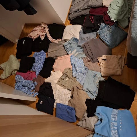 Jenteklær i størrelse XS og Small med flerfarget. Lite brukt, noen av plaggene er ikke brukt i det hele tatt. De er hele og pene, ingen flekker, hull eller slitasje. 3 stk hettegensere, 2 basic gensere, 3 stk pologenser, 2 x strikket genser og 1 stk kortermet. 2 stk vesker. Klær fra Bik Bok, Ambar, 157, Cubus og Divided. Totalt 11 plagg klær selges samlet. Dyr og røykefritt hjem.