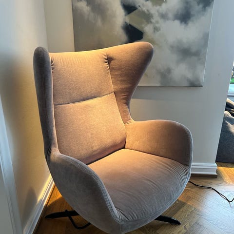 Pen og komfortabel "Solo" lenestol fra Bolia i blekrosa og slitesterkt stoff. Kan roteres helt rundt. Hentes på Adamstuen i Oslo. NB Pris på en slik stol på Bolia idag (inkl 40% rabatt!) er ca 30.000 kr.